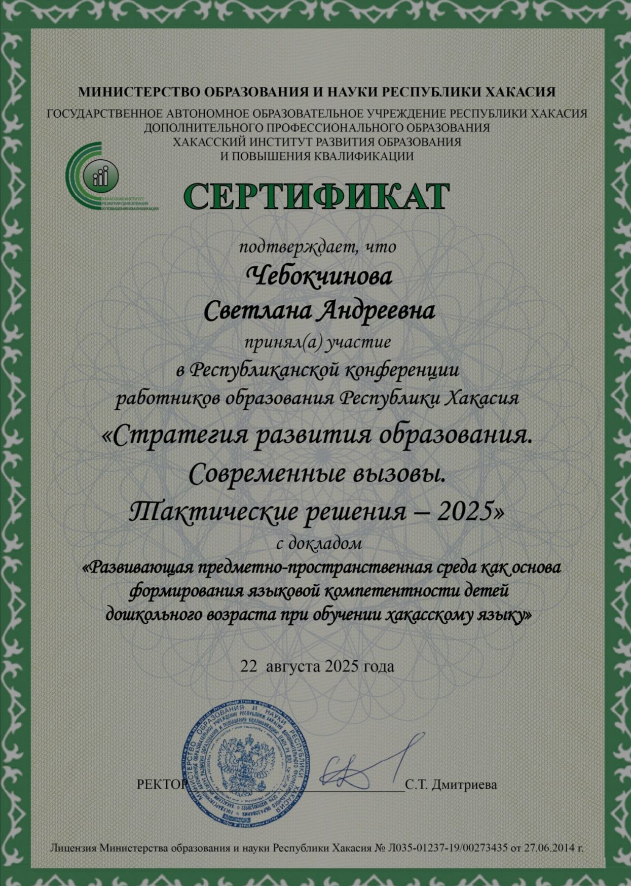 Республиканская конференция работников образования Республики Хакасия "Стратегия развития образования.Современные вызовы.Тактические решения - 2025 с докладом "Развивающая предметно-пространственная среда как основа формирования языковой компетентности детей дошкольного возраста при обучении хакасскому языку"
